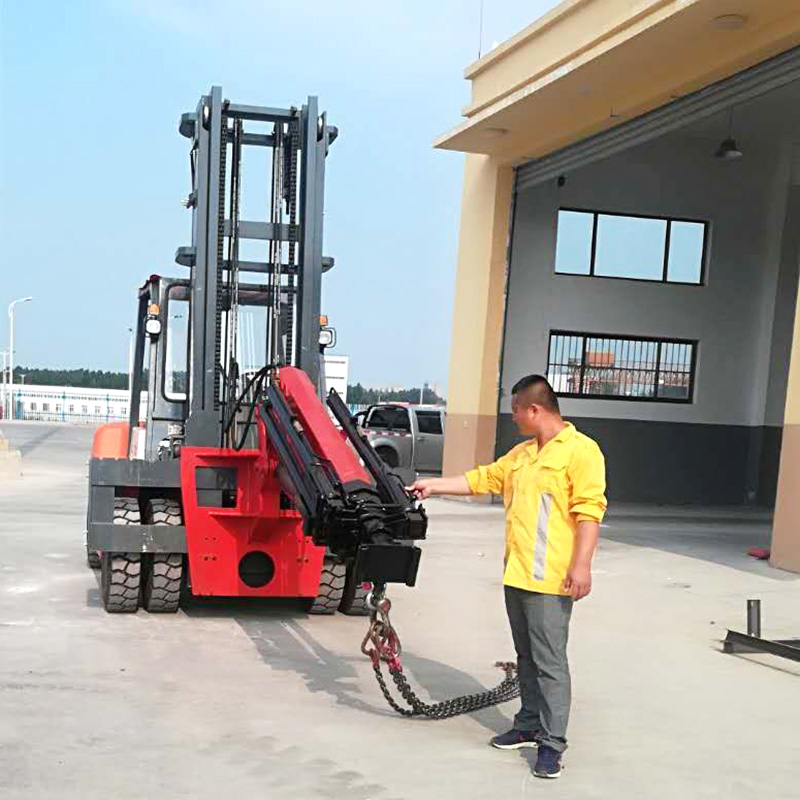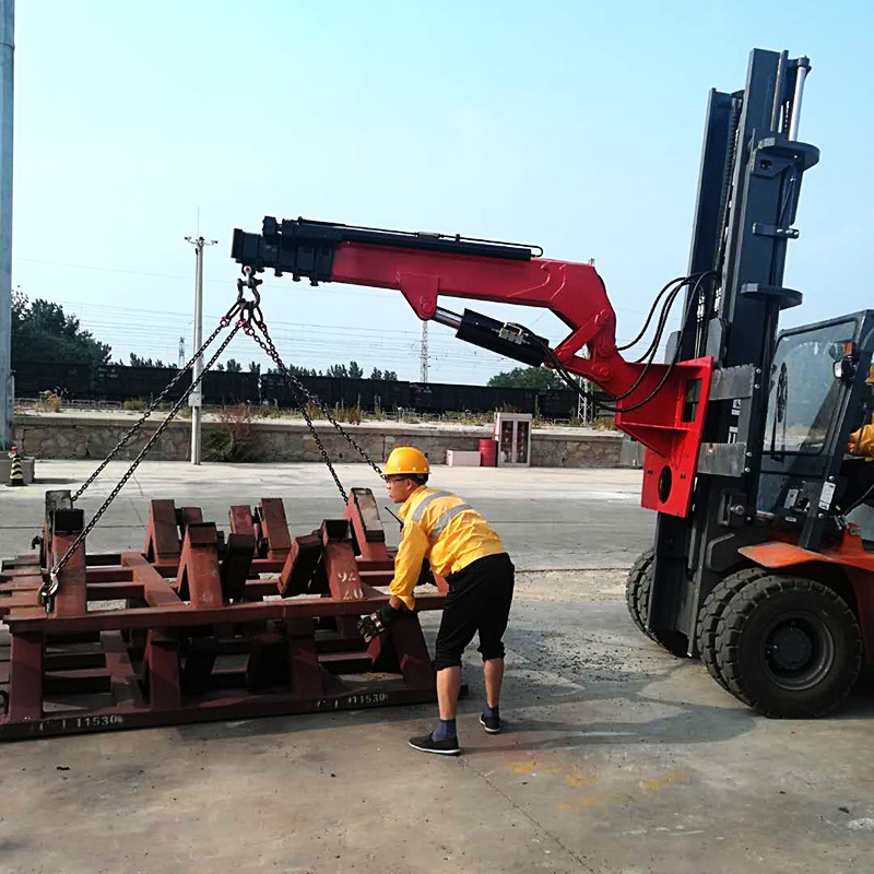 叉車飛臂吊可擺動角度實現(xiàn)低空,高空取物。吊臂油缸驅(qū)動伸縮實現(xiàn)設(shè)備貨物定位。